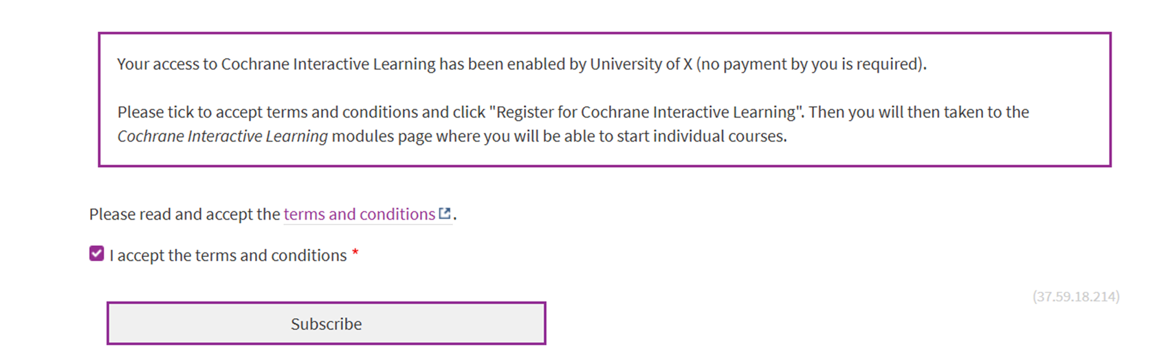 9. Tick to accept the terms and conditions. Click Subscribe for Cochrane Interactive Learning.