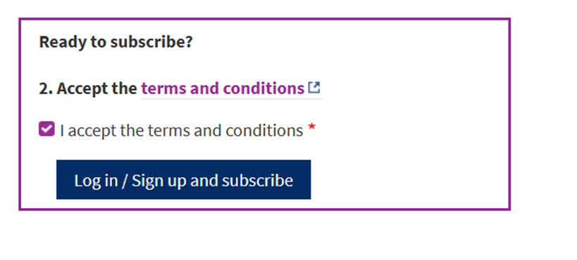 The university's branding will appear above this message. Please tick "I accept the terms and conditions", then click "Subscribe"