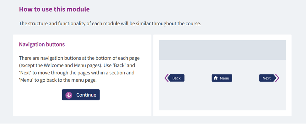 • Each module begins with a brief 'How to use this module' section, which shows you how to navigate around the content, bookmark favourites for reference when you need them, and filter content to find the most relevant topics for you.