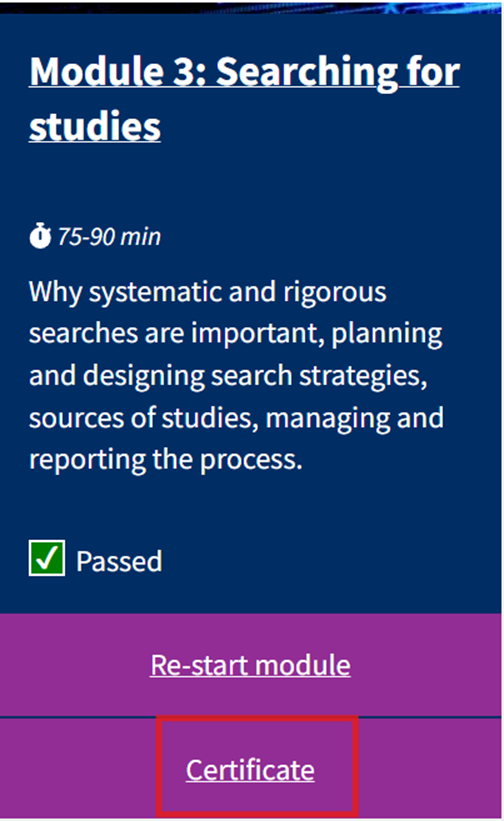 When you have completed a module and passed the assessment you will be able to download a certificate, available from the 'Certificates' button at the bottom of the home page. When you have completed all available modules, you will be able to download a certificate of completion for the full course