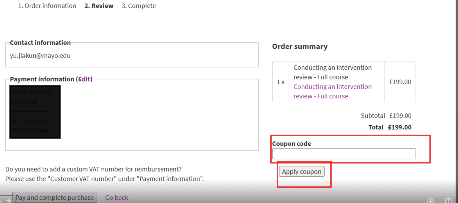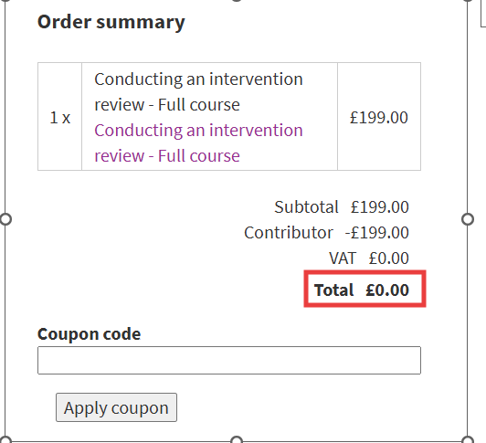 5. You must complete the check out page by entering the code in "Coupon code" field and click "Apply coupon" to complete the process. You will see the price reduced to £0.